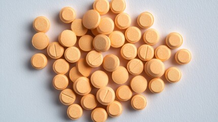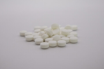 Pile of white pills on neutral background. Bupropion.