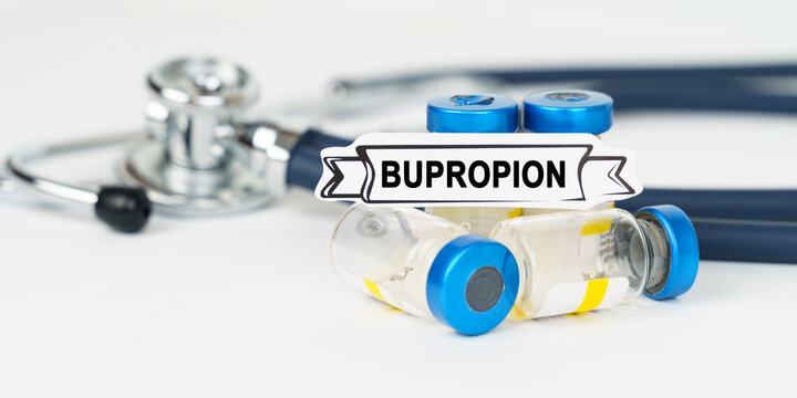 On the table there is a stethoscope, injections and a sign with the inscription - Bupropion