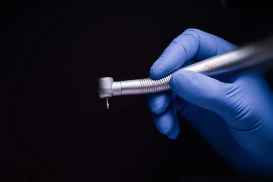 Close-up shot of a dental drill without a tip. A dentist or dental technician in black gloves is replacing a bur or drill cutter. Dental office. Dentist's tools. Selective focus, blurred background.