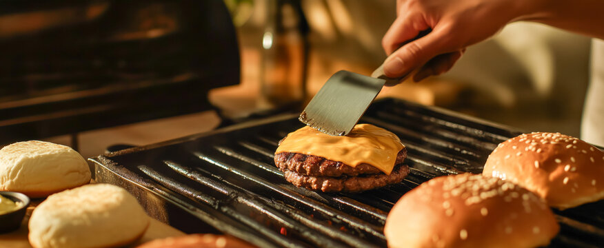 A juicy cheeseburger patty sizzling on a grill beside fresh burger buns.