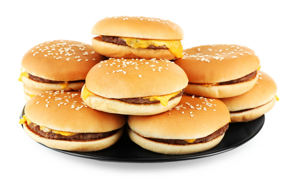 Tasty cheeseburgers on plate, isolated on white