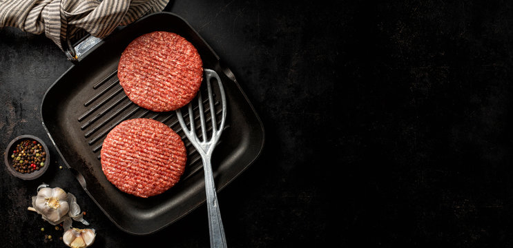 beef burger patties on griddle pan cooking. copy space for design mockup