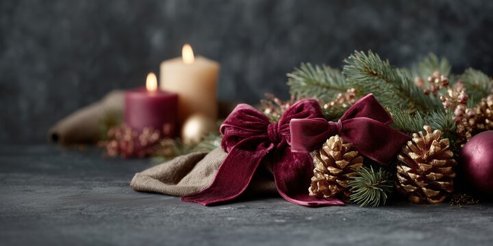 Closed dark red burgundy velvet curtains at theater stage. Elegant show, performance backdrop. Luxury theatrical drapes background with empty scene, spotlights. Velvet material classic design for