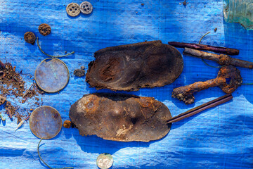 Retro leather insoles on blue burlap. Archaeological excavations of criminologists for examination. Background