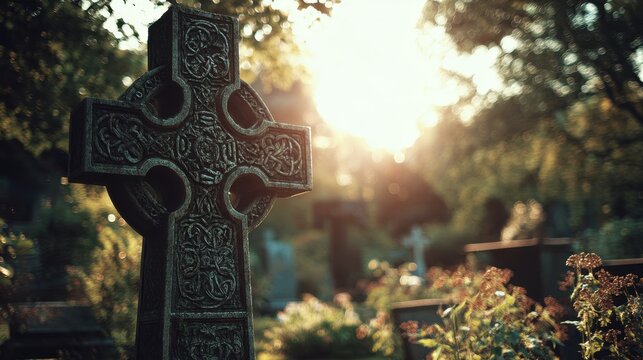 Abstract depiction of a Celtic cross grave marker in a cemetery illuminated by sunlight and color toned