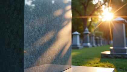 Gray granite vertical tombstone monument on cemetery, sun shining on background. Funeral home service, burial and saying goodbyes. Memories and respect for the passed people, memorial days. Copy space
