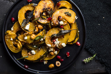 Roasted Butternut Squash topped Browned Sage and Pistachios on Dark Background