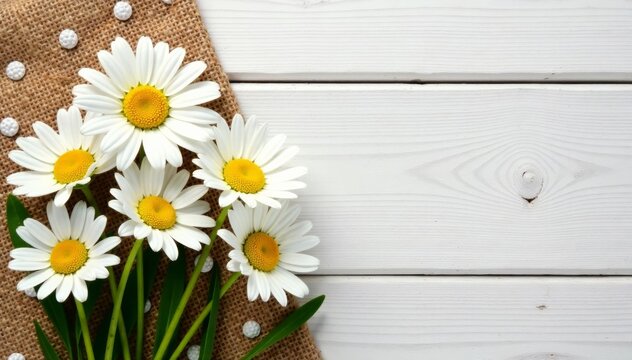 Row of white daisies on a burlap tablecloth with polka dot accents and whitewashed wooden planks surrounding it, floral arrangement, white flowers