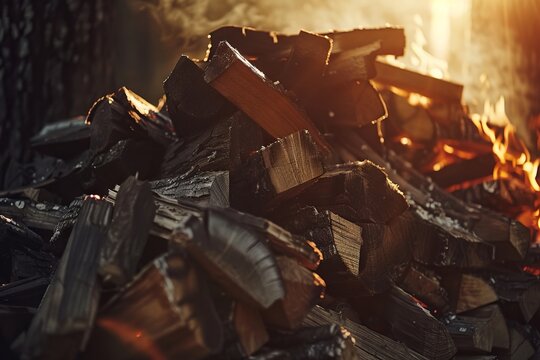 Flames dancing over burning logs at night campfire close-up conveying warmth and smoke