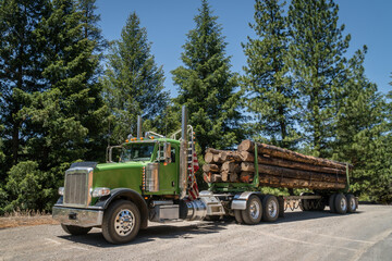 Logging truck loaded with previously burned trees being taken to lumber mill for processing into lumber for the booming housing construction market.