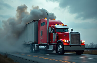 Highway Accident Scene – Damaged Semi-Truck with Debris and Smoke on Asphalt Road Copy Space