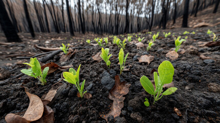 Charring forest recovering with new seedlings being planted amidst burnt trees and blackened earth