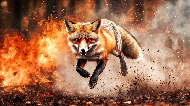 Fiery Fox: A Majestic Red Fox Running Through a Blaze of Fire