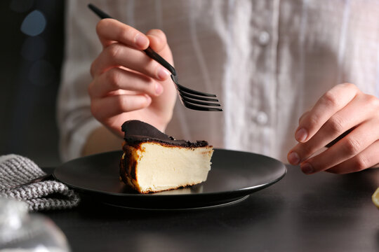 basque burnt cheesecake on white plate, fresh baked cheese cake on table