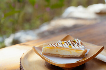 Piece of Lemon cheesecake tart slice with fresh lemon curd meringue burnt on wooden dish and table. Delicious and sweet dessert.