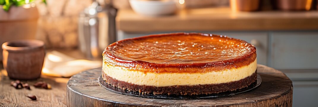 Close-up of a burnt Basque cheesecake with a perfectly caramelized top, soft natural light highlighting the rich texture, Basque cheesecake, indulgent dessert