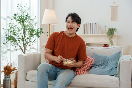 Two friends experiencing virtual reality games on sofa laughing and reacting