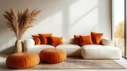 Modern white sectional sofa with burnt orange velvet cushions and matching round ottomans in a sunlit room with pampas grass in a ceramic vase and large window
