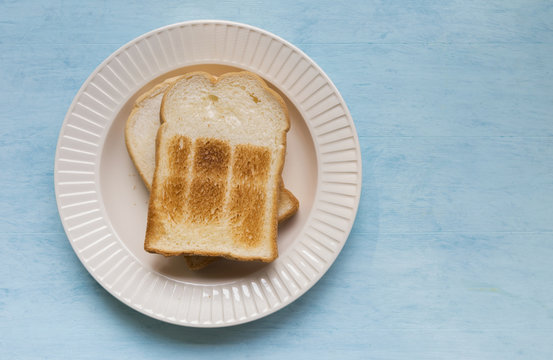 Half eaten buttered slice of whole wheat toast and whole dry slice of toast isolated on white from above.