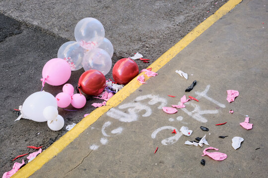 Bursting colorful geometric confetti scattering toward right on dark gray canvas