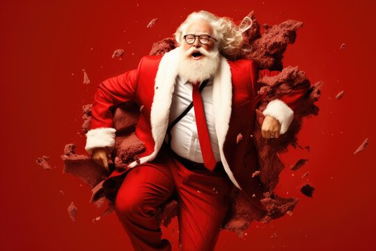 exuberant Santa Claus bursting through a red backdrop with festive energy