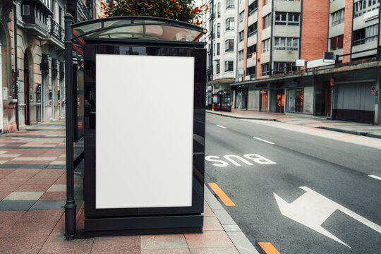 Vertical blank white billboard at bus stop on city street. In the background buildings and road. Mock up. Poster on street next to roadway. Sunny summer day.