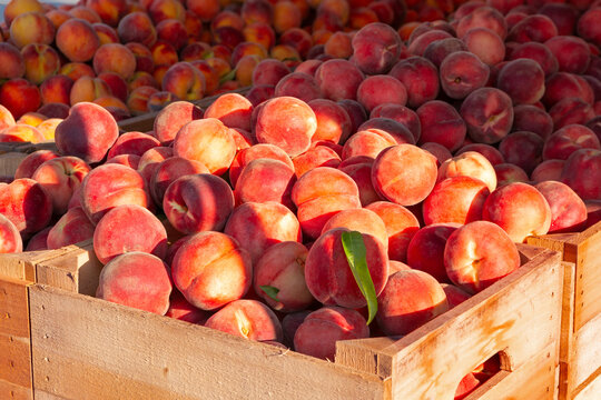 Early morning light shines on fresh ripe peaches in a bushel crate at an outdoor farmer's market