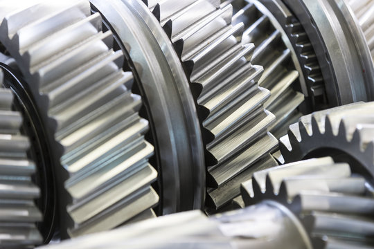 New metal auto parts on grey background