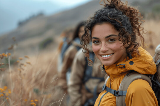 Young Woman Smiling While Hiking in Natural Landscape Wearing Yellow Jacket and Backpack