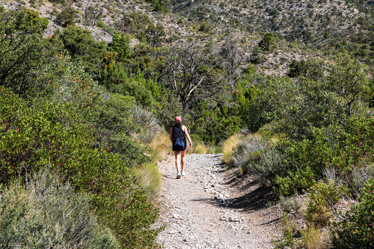 Hiker on Rocky Trail Surrounded by Greenery in Mountainous Terrain
