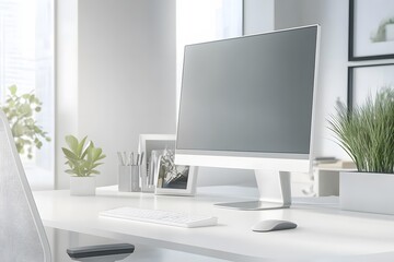 White Desk with Computer, Keyboard, Mouse, and Plants