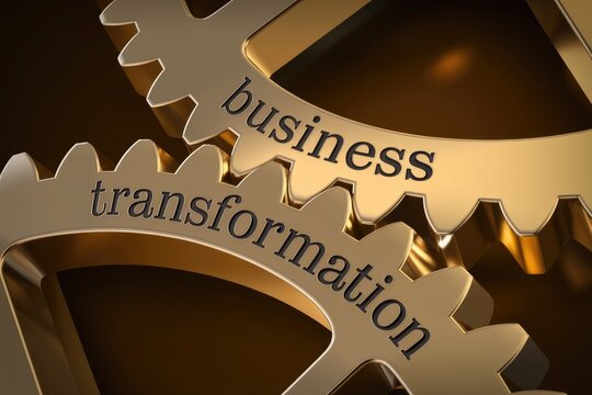 Golden gears with 'business transformation' inscribed  representing change and growth.