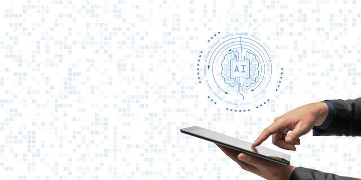 Hands interacting with a tablet displaying an AI brain icon on a digital grid background, representing technology and machine learning