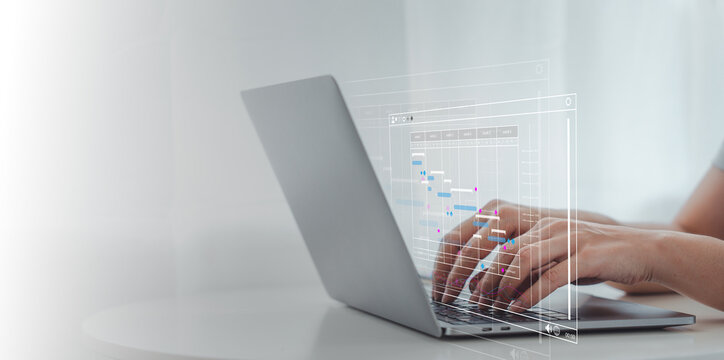 Analyst working with computer in management system to make report with KPI and metrics connected to database. corporate strategy for finance, operations, sales, marketing.Project management concept.