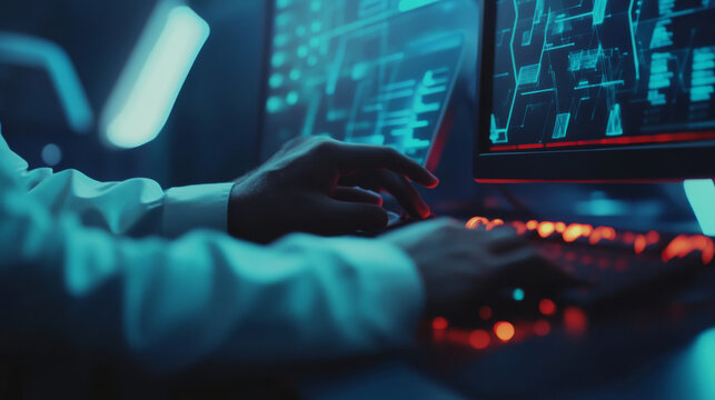 Analyst visible within illuminated financial data graphs and charts