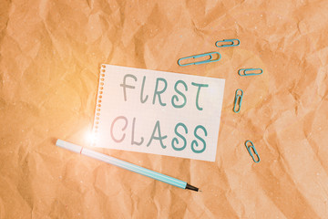 Writing note showing First Class. Business concept for the most expensive and most luxurious class of accommodation Papercraft desk square spiral notebook office study supplies