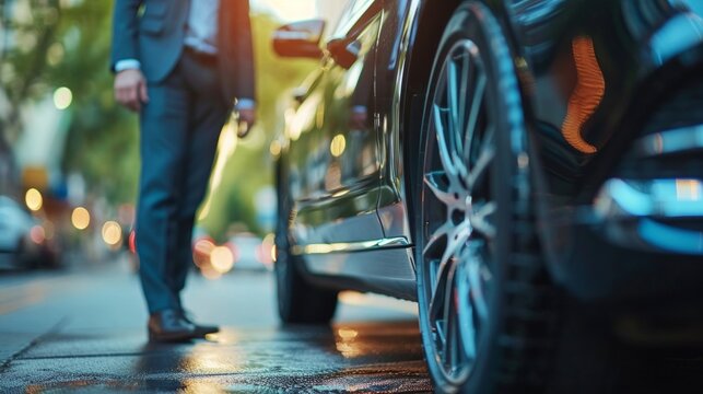A professional driver is waiting for a businessman to get into the car for a ride to the airport or another destination.