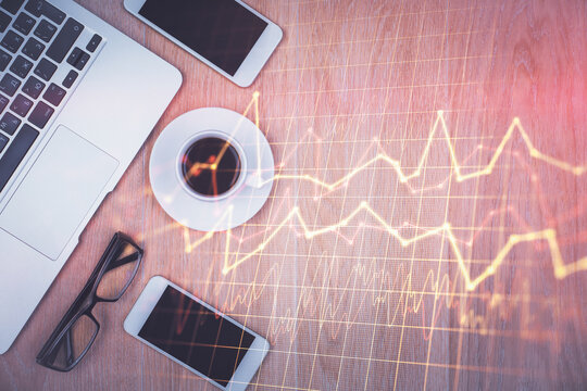 Double exposure of forex graph hologram over desktop with phone. Top view. Mobile trade platform concept.
