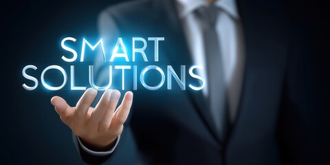 Smart Solutions, Manager holding glowing futuristic text "Smart Solutions" in a modern tech-inspired office, showcasing innovation with copy space for your design.