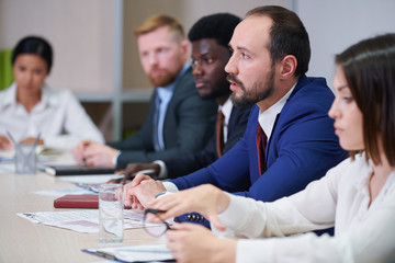 Diverse group of smiling professionals in business attire at meeting, workshop. Team discussion consultation in positive collaborative atmosphere. Corporate business people during brainstorming