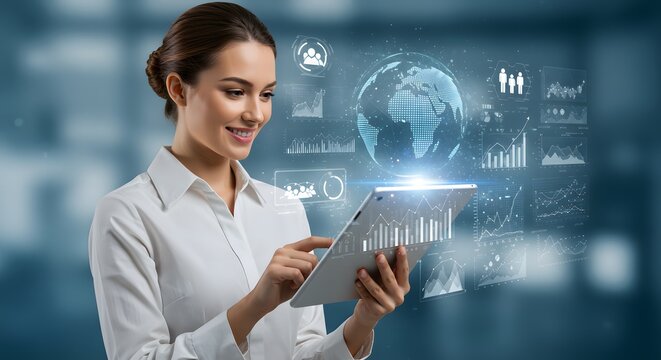 Business executive tapping tablet with holographic data visuals for corporate analytics