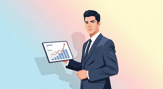 Sophisticated financial analyst in business attire holding a tablet, blurred stock market charts behind. AI generated.