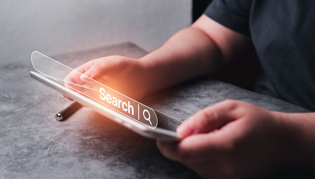 Woman use digital tablet for searching online. Data Search Technology Search Engine Optimization. SEO concept. VR interface for browsing on internet.