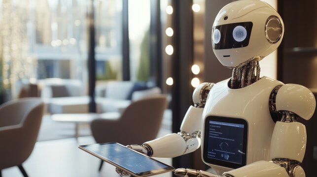 Humanoid robot working with a tablet to navigate a virtual interface, tech-savvy conference room