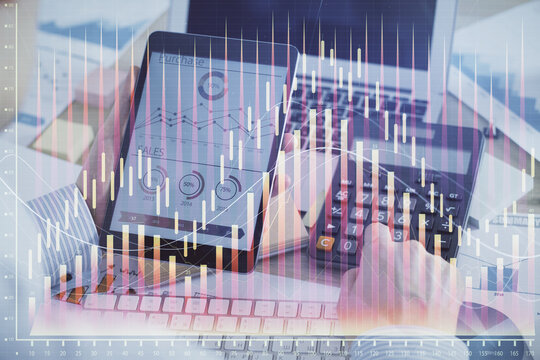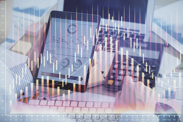 Double exposure of man's hands holding and using a digital device and forex graph drawing. Financial market concept.