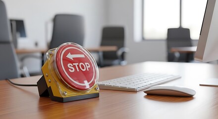 Red Stop Button in Office Halt with Control, System Failure, Halt, and or Emergency.