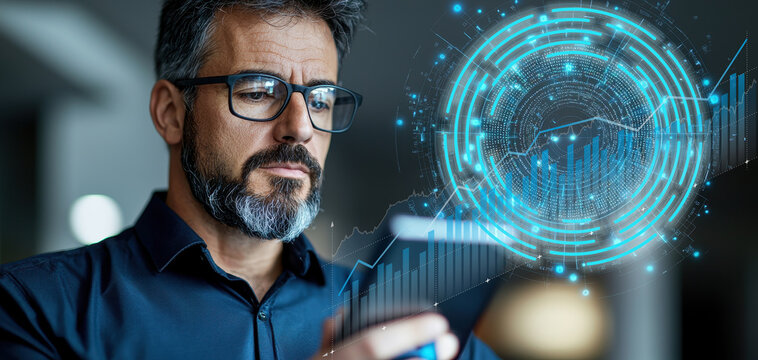 A businessman in a suit gestures towards a holographic financial chart, representing market analysis and business growth with modern technology.