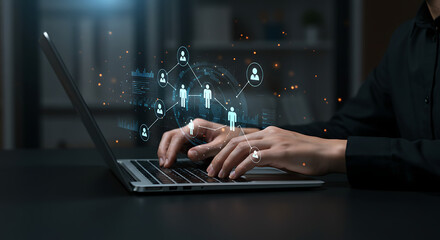 Connecting through technology: A person typing on a laptop with a network visualization overlay, showing digital connections.