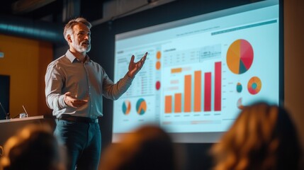The expert presents key findings at a conference, using colorful charts and graphs to illustrate complex data and engage the audience. Generative AI