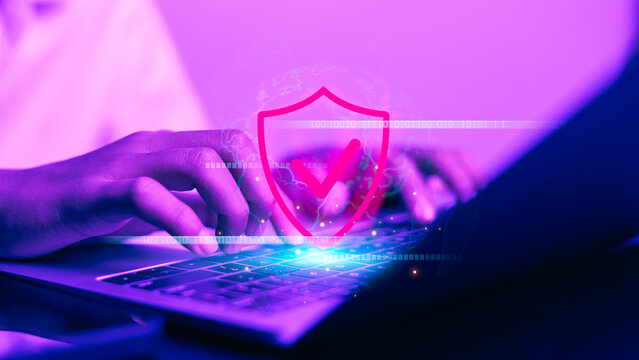 Close up of hands typing on laptop keyboard with colorful business data charts and financial graphs overlay, representing analytics, growth strategy and digital marketing in modern office.